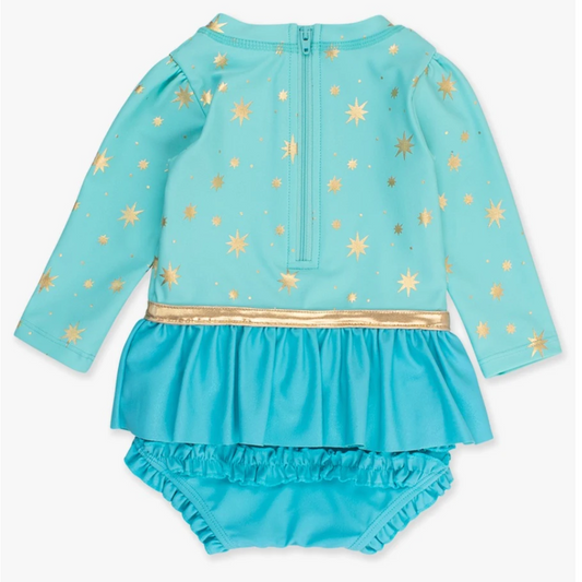 Ruffle Butts Teal Golden Princess Long Sleeve Bow Skirted One Piece Swimsuit