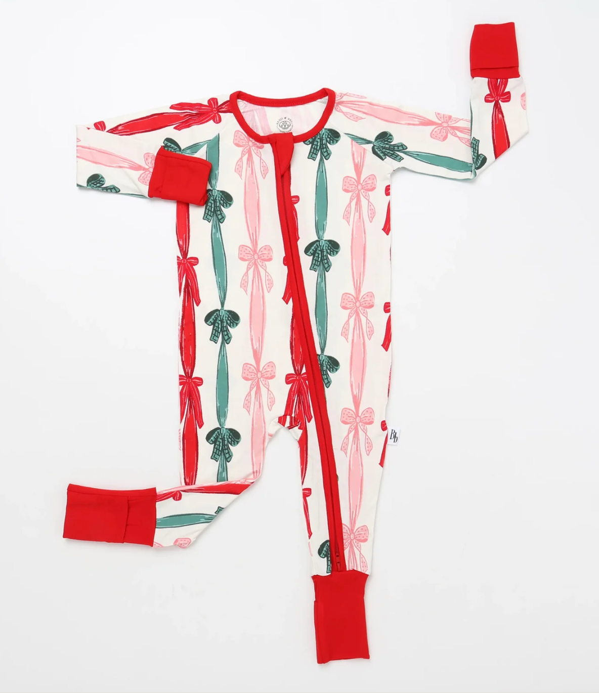 Wrap your little one in cozy comfort with these adorable Benji & Bru Christmas Bows Zippies, crafted from 100% bamboo fabric that's naturally soft and breathable. Featuring convenient double zippers for easy diaper changes and bedtime, plus foldover mittens and booties to keep tiny hands and feet warm and protected. The festive Christmas bow design makes these perfect for holiday photos and celebrations. Bamboo's hypoallergenic properties make them ideal for sensitive skin, while the fabric naturally regulates temperature for all-night comfort. Give your baby the gift of cozy, stylish pajamas this season.