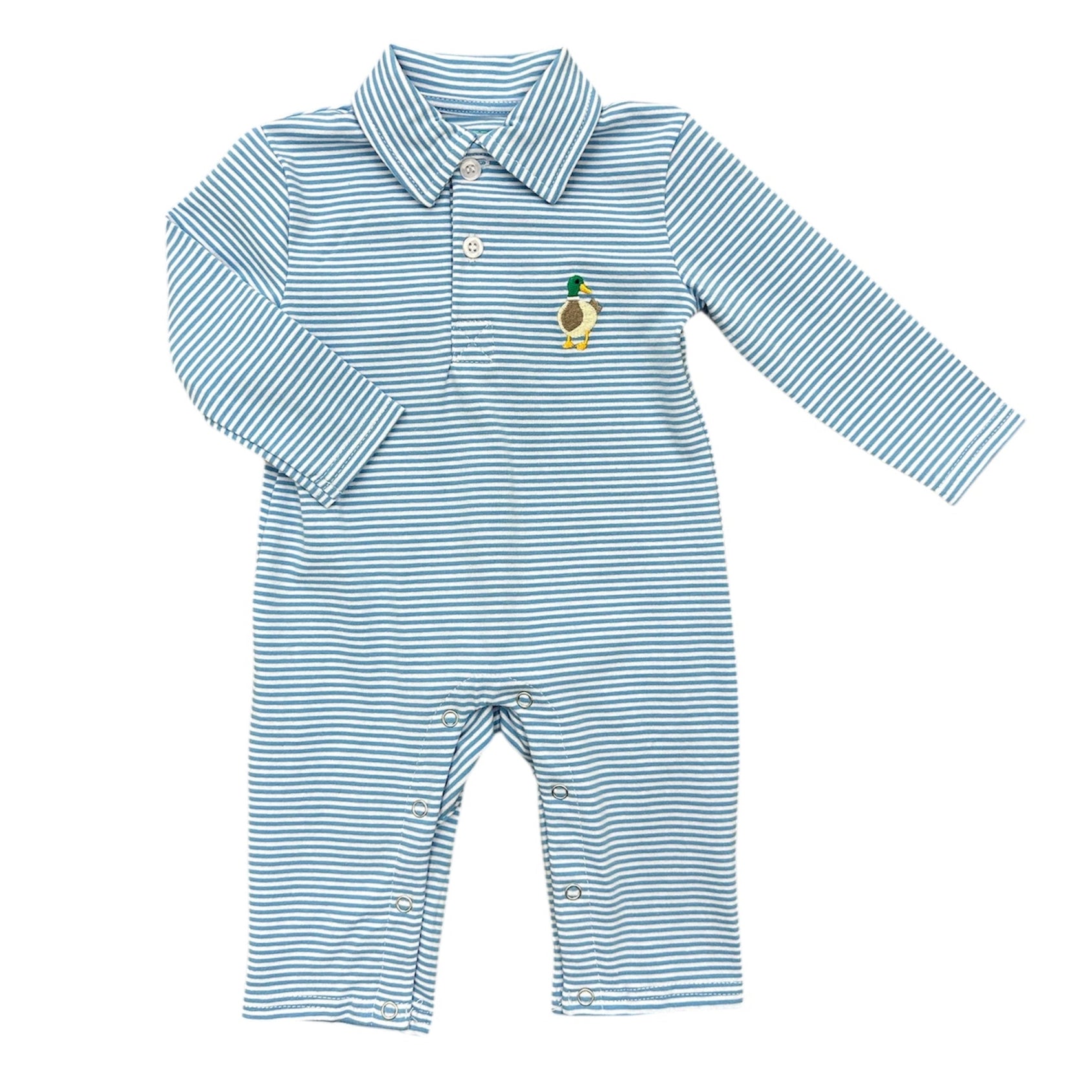 Dress your little one in classic comfort with the Itsy Bitsy Mallard Polo Romper. Featuring soft blue and white stripes and a charming embroidered mallard duck, this romper combines style with practicality. Convenient snaps at the crotch make diaper changes quick and easy, while breathable fabric ensures all-day comfort. Perfect for playdates or family outings, this romper keeps your baby boy looking adorable and feeling cozy.