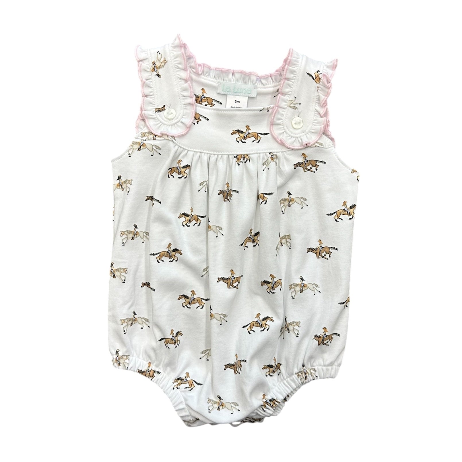 Adorable sleeveless bubble romper crafted from soft pima cotton for delicate skin. Features charming horse print throughout, with decorative ruffles adorning the shoulders and functional buttons for easy dressing. Convenient snap closures at the crotch make diaper changes quick and hassle-free. Perfect for warm weather playtime or special occasions, this sweet bubble combines comfort with playful style.
