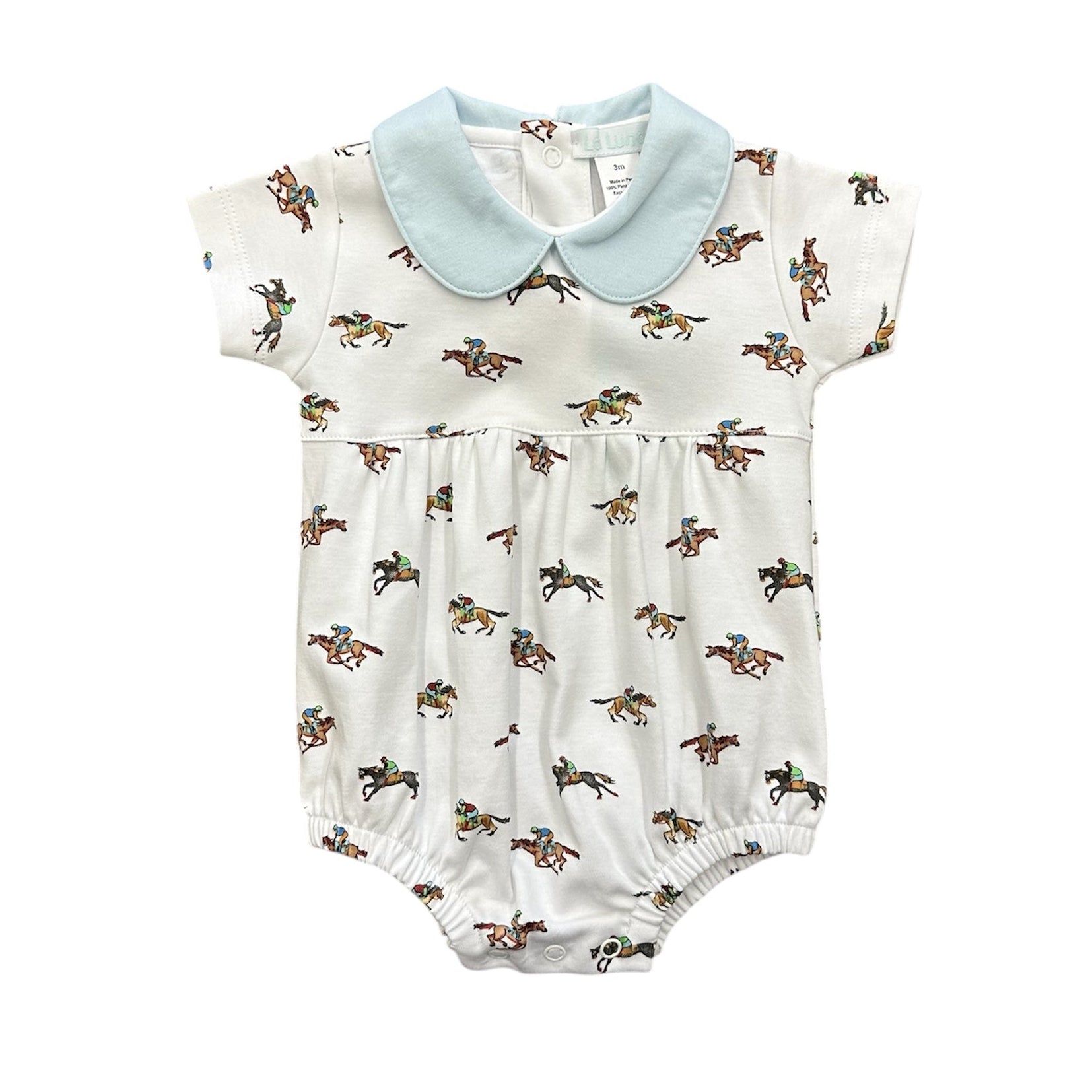 Adorable horse print bubble romper designed for baby boys who love classic style. Crafted from soft, breathable pima cotton for all-day comfort. Features a collared neckline and short sleeves perfect for warm weather play. Convenient snap closures at the crotch and back make diaper changes and dressing effortless. The charming horse print adds a touch of whimsy to any outfit. Ideal for playdates, family gatherings, or everyday wear.