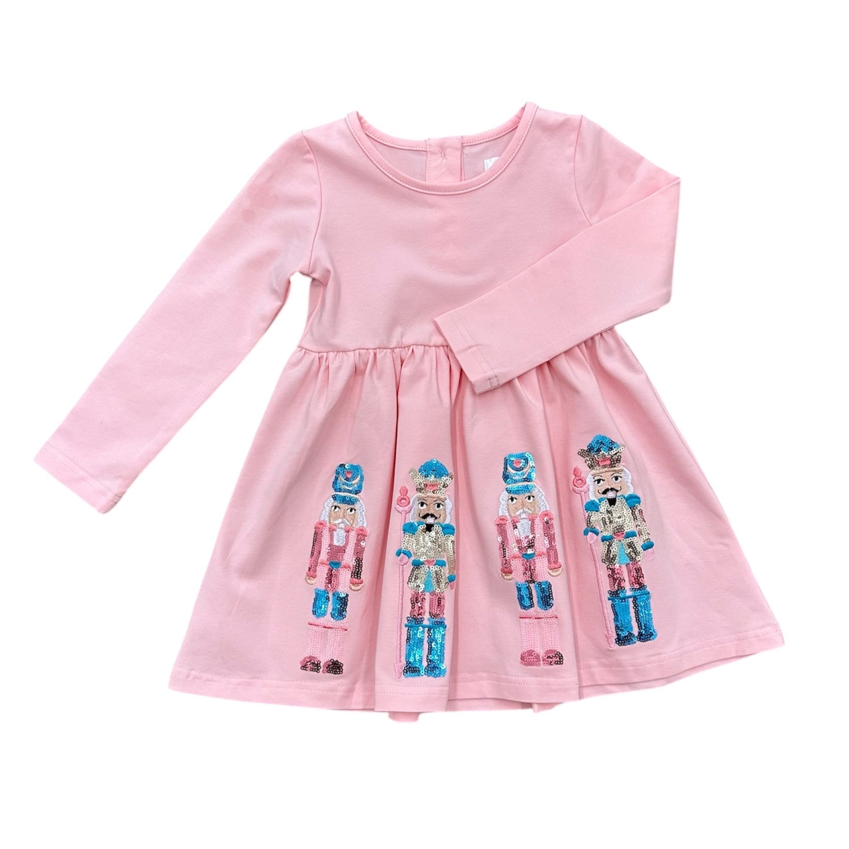 This charming pink long sleeve dress features dazzling nutcracker-shaped sequins that bring a festive sparkle to any occasion. Designed for both comfort and style, its soft fabric and graceful fit make it perfect for holiday parties or special moments. Delight in a unique look that captures the magic of the season with every twirl.