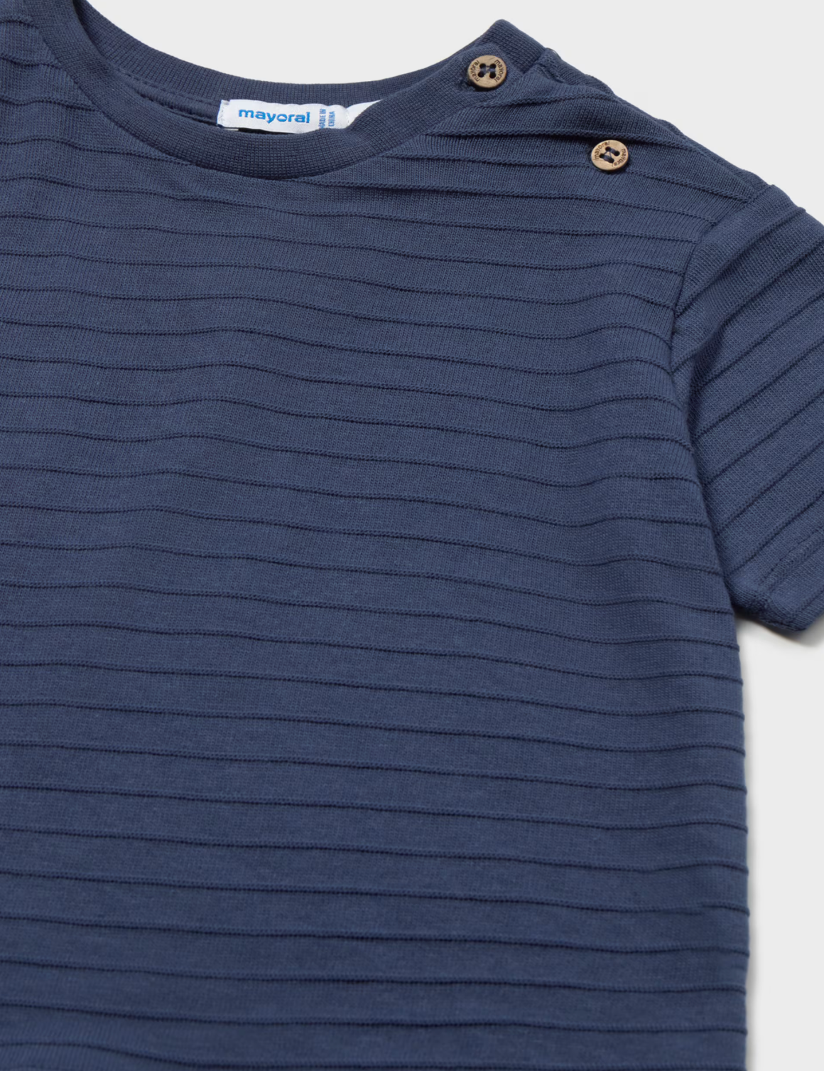 Soft and stylish, this navy baby boy t-shirt features a subtle textured fabric that adds visual interest while remaining gentle against delicate skin. The classic crew neckline and short sleeves make it perfect for everyday wear, layering, or special occasions. Easy to care for and designed for comfort, this versatile piece pairs effortlessly with any outfit in your little one's wardrobe.