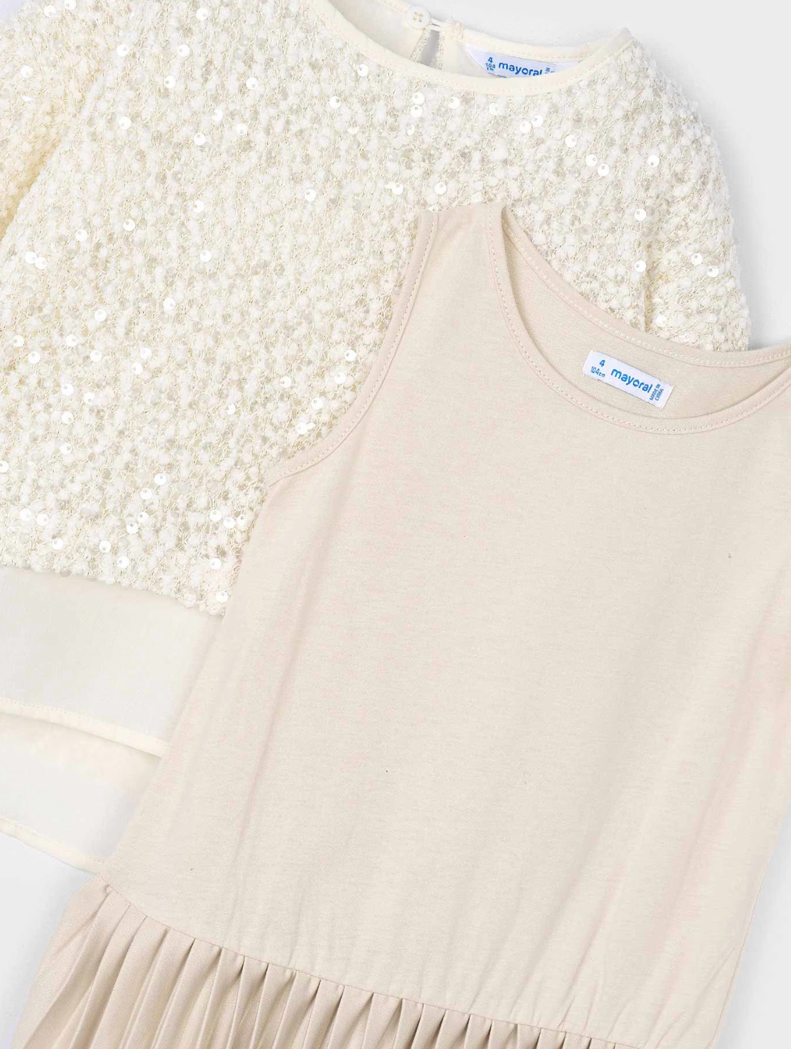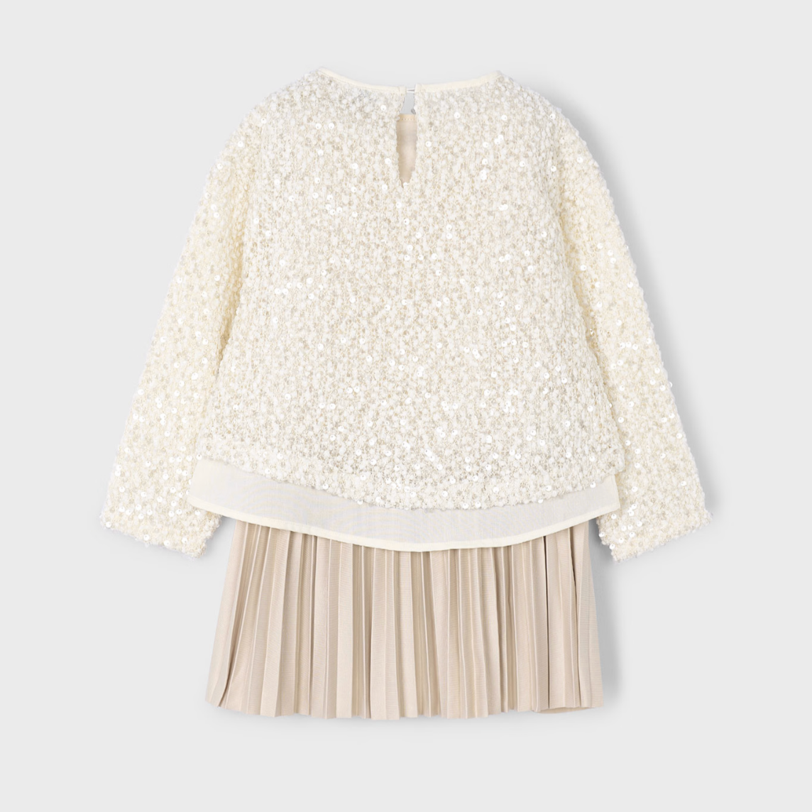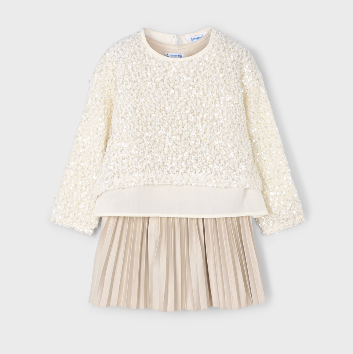 The Mayoral Girl Kara Combined Dress features a charming pleated jumper layered under a cozy sweater, creating a stylish and comfortable outfit perfect for any occasion. This versatile dress offers both warmth and elegance, making it an ideal choice for your little girl's wardrobe. Easy to wear and beautifully designed, it ensures she looks adorable while staying comfortable throughout the day.