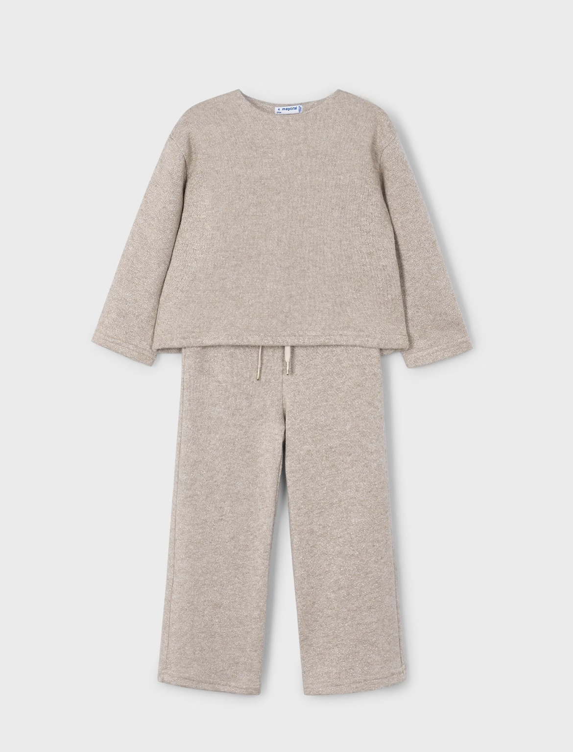 This girls' matching sweater and pants set offers both comfort and style. The relaxed-fit sweater features a soft knitted fabric, a round neckline, and a charming bow detail for a touch of sweetness. The coordinating pants come with an elasticated waistband and adjustable drawstring, ensuring the perfect fit while maintaining all-day comfort. Crafted from the same soft, pleasant-to-the-touch fabric, this set is ideal for everyday wear or special occasions.