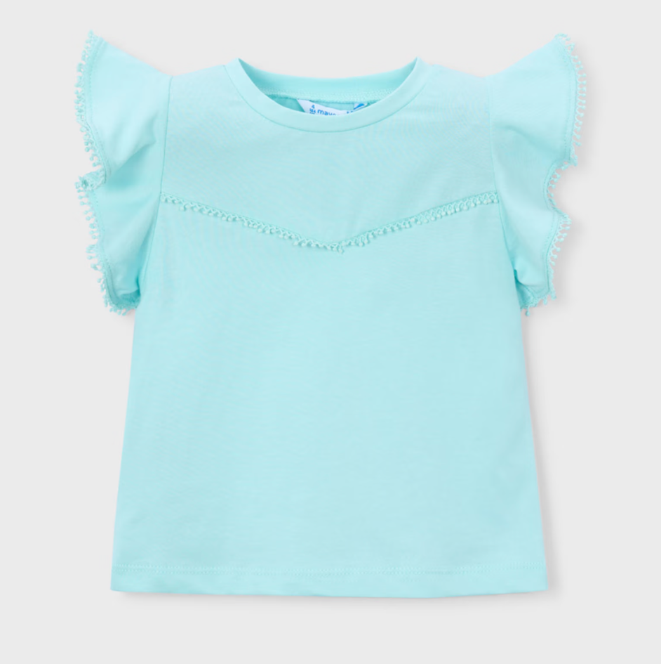 Introduce your little one to effortless charm with this delightful Mayoral Girl Whimsy Aqua Shirt. Crafted from soft, breathable cotton, this piece features playful flutter sleeves that dance with every movement, paired with cheerful pom pom trim adorning the sleeves and cascading across the chest. Perfect for adding a touch of whimsy to everyday outfits or special occasions, this versatile aqua shirt combines comfort with eye-catching details that make getting dressed fun. A wardrobe essential that celebrates childhood joy and style.