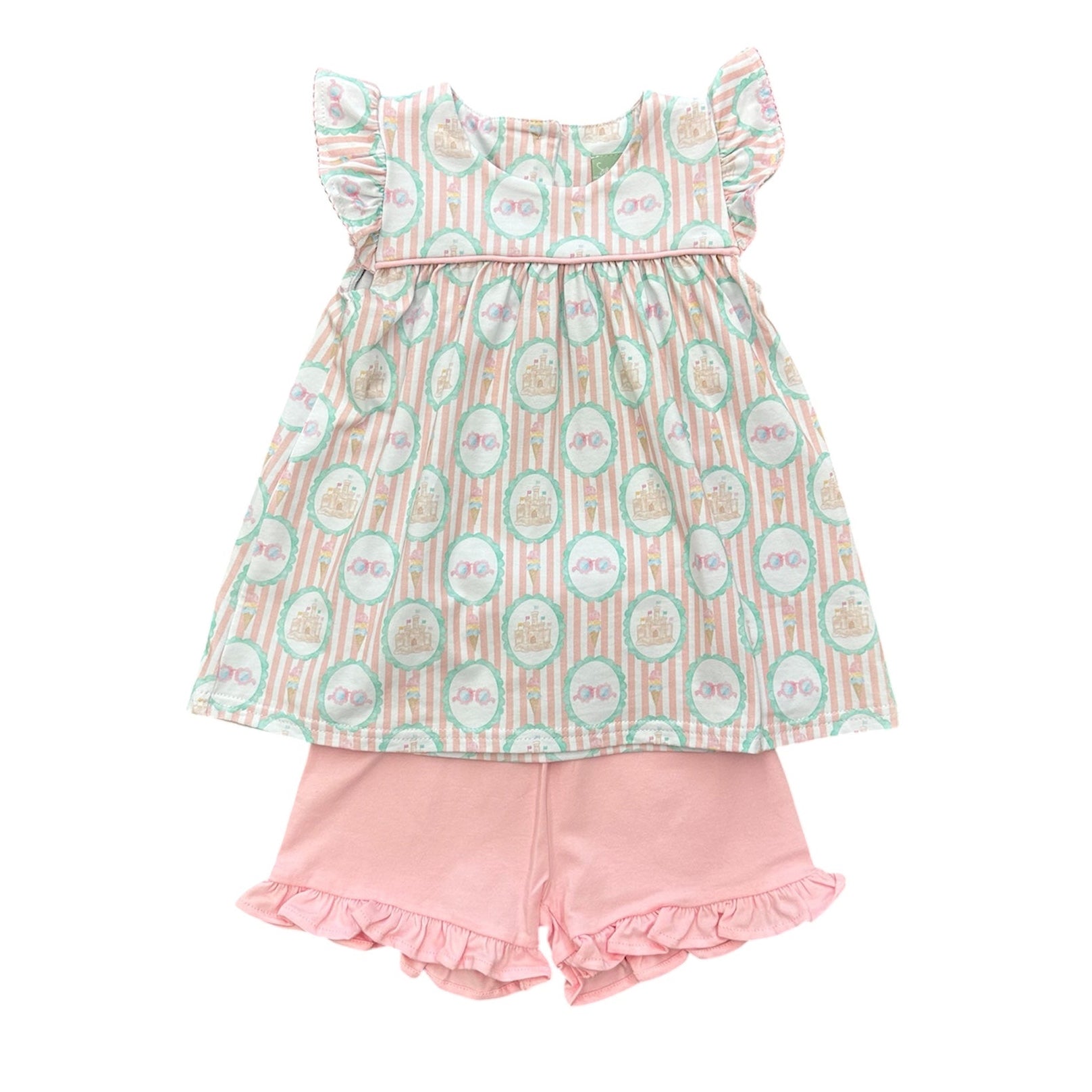 Let your little one make a splash this season in the Sage & Lilly Sand Castle Abi Short Set. Featuring adorable flutter sleeves and pink ruffled shorts, this playful two-piece set captures the magic of beach days with charming ice cream and sand castle prints. Perfect for warm weather adventures, pool parties, or casual outings. Includes matching sunglasses to keep her eyes protected while she plays. Comfortable, fun, and oh-so-cute!