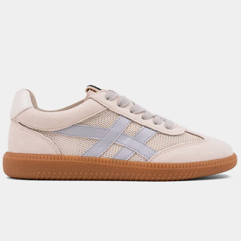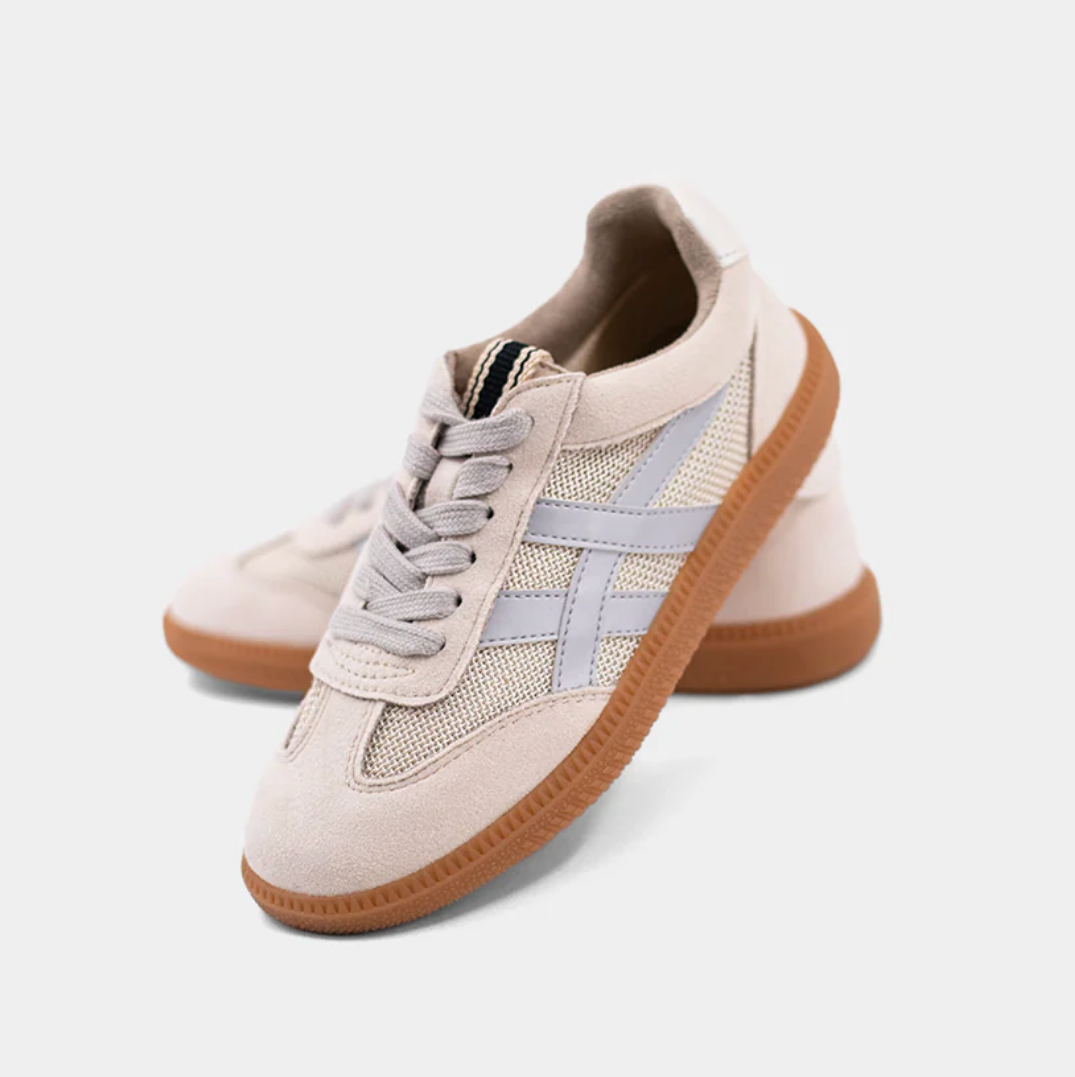 The SASHA MINI in Beige combines chic design with everyday practicality for kids and toddlers. Crafted with premium beige suede and breathable mesh, it offers a sleek, modern look enhanced by metallic silver faux-leather stripes. The durable gum rubber sole ensures comfort and grip for all-day adventures, while toddler sizes feature velcro closures for easy on-and-off. Finished with light gray laces and the signature "S" metallic tag.