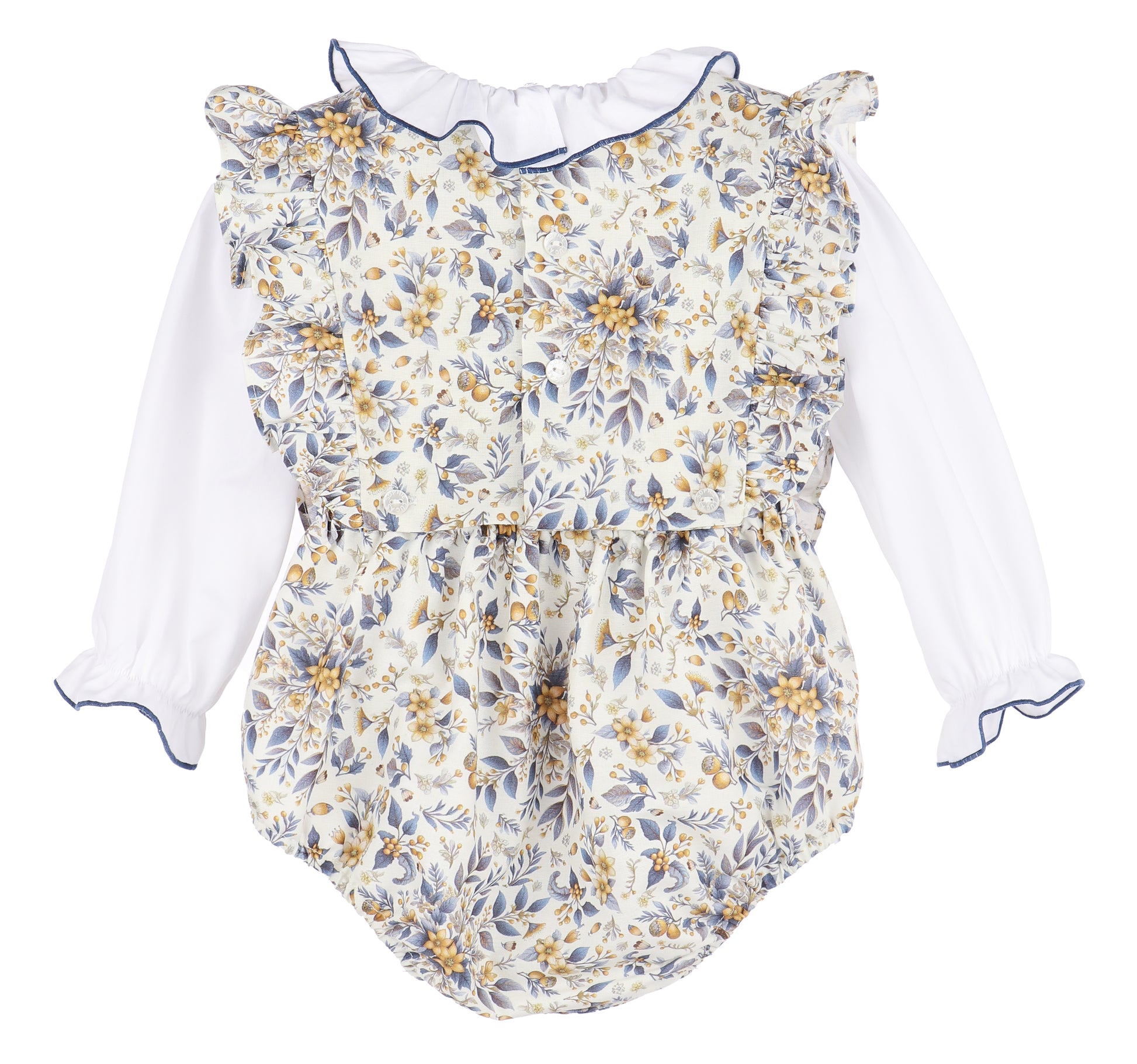 Dress your little one in the Sophie & Lucas Marigold OG Overall, a versatile baby girl’s outfit designed for multiple styles. Featuring a charming floral pattern with delicate gold bows and a detachable ruffle collar, this bubble overall can be worn on its own or paired with the matching top and bloomers for added sweetness. Perfect for everyday wear or special occasions, its adaptable design ensures comfort and charm no matter how you style it.